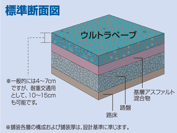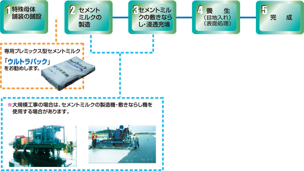 特別に空隙率を大きくしたアスファルト混合物を舗設し、その空隙に特殊なセメントミルクを充填することによって、アスファルト舗装が持つたわみ性と、コンクリート舗装が持つ耐久性を融合させた、耐超重荷重・耐静止荷重舗装です。