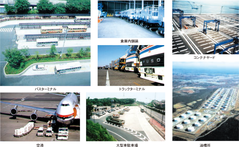 重交通道路/バスターミナル/トラックターミナル/コンテナヤード/大型車駐車場/トンネル内舗装/工場内道路/油槽所/空港/倉庫内の床舗装/その他、耐超重荷重、耐静止荷重、耐油、耐熱、耐薬品性を必要とする箇所