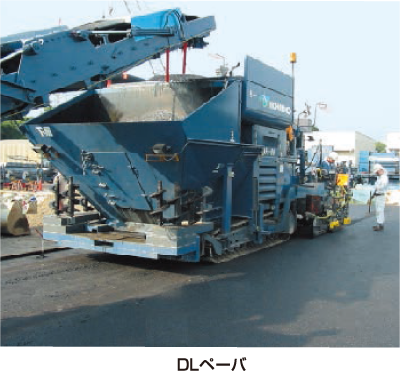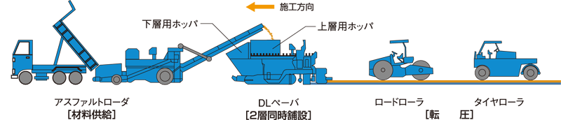 DLペーブ(Dual Layer Pavement)とは、2種類のアスファルト混合物を上・下層に分けて同時に舗設できるフィニッシャ(DLペーバ)で敷きならし、ローラで仕上げる舗装です。アスファルト混合物はDLペーバの上層・下層用別々のホッパに材料供給機から補給されます。