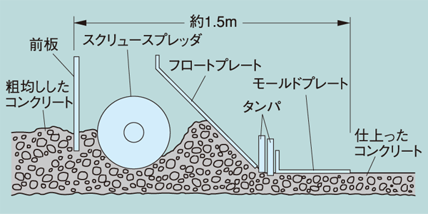 フロープレートの振動により流動化したコンクリートは既設床版の凹凸に関係なく充分に締固められ、モールドプレードによって所定の形状に仕上げられます。