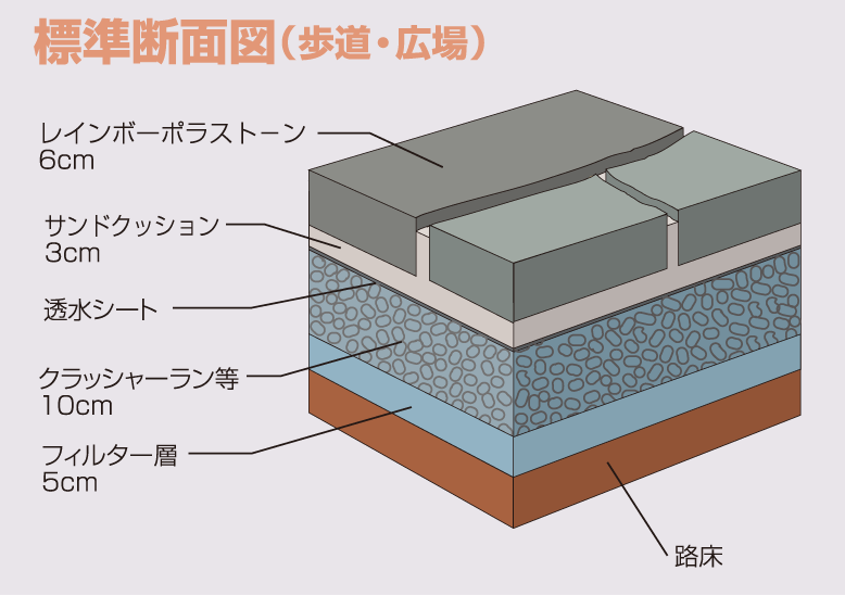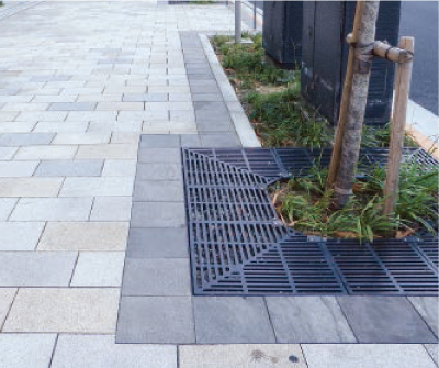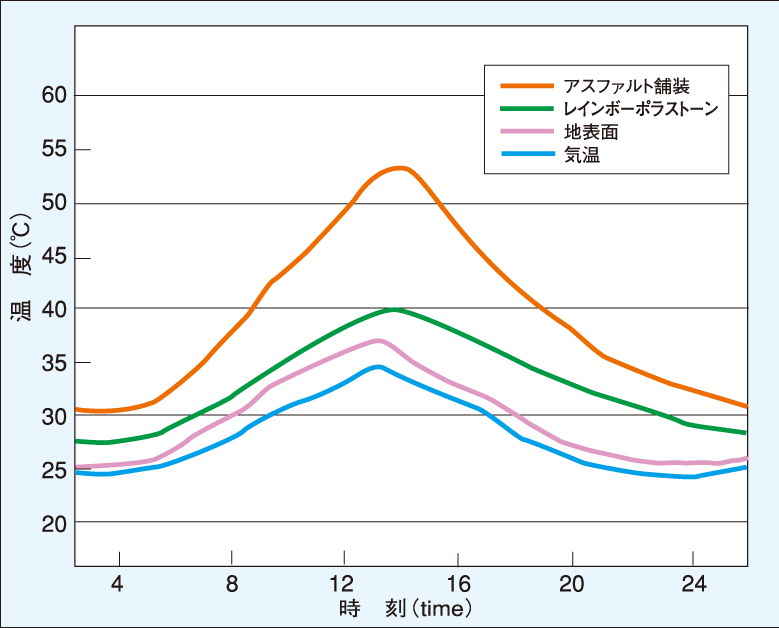 - ヒートアイランド抑制/保水性により路面温度の上昇を抑制することができるので、ヒートアイランド現象を抑制し、歩きやすい路面を提供します。