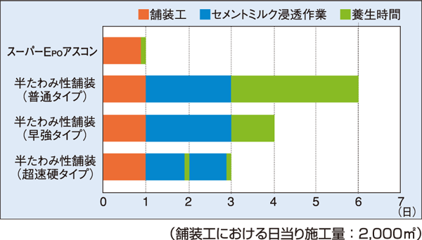 • 施工性/通常のアスファルト舗装と同様な機械編成で施工でき、半たわみ性舗装に比べ早期交通解放が可能です。