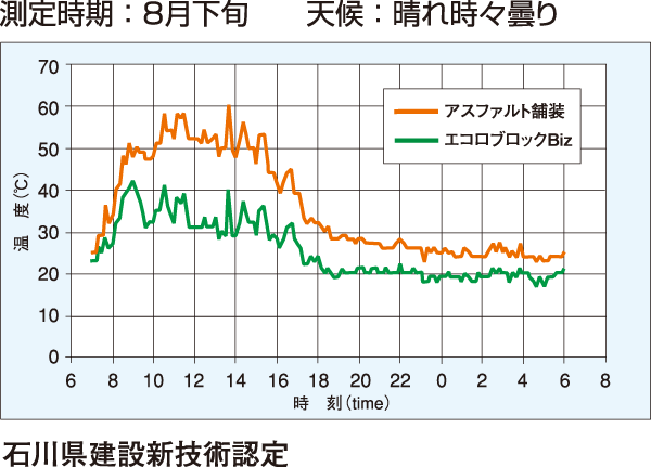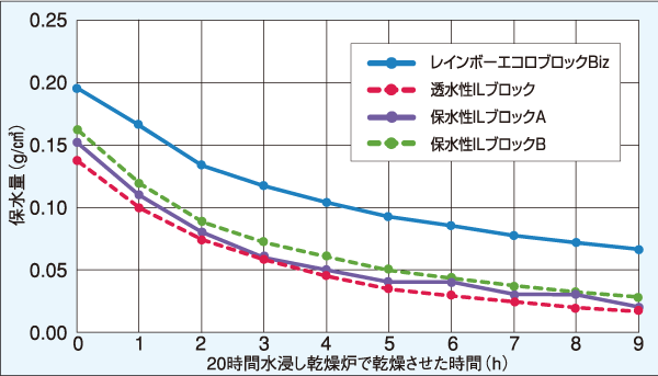 • 保水性/保水量が従来の保水ブロック(0.15~0.18g/cm3)と比較して多く(0.22g/cm3以上)を確保、路面温度低減効果が長期間持続し、雨水流出抑制にも寄与します。