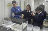 都内の幹線道路や高速道路などに多く採用されている、“雨の日でも路面に水たまりが発生しない”「排水性舗装」と、一般的な舗装のサンプルに実際に水をかけ、両者の違いを見る体験をしてもらいました。排水性舗装に水をかけると水が中を通る一方、一般的な舗装では水が通らず表面にたまっている様子に生徒さんたちはとても驚いていました。
